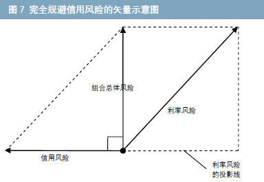 而要完全规避信用风险,必须使得组合总体风险与信用风险达到矢量垂直状态(使两者达到完全不相关),即利率风险的投影线与信用风险大小相等、方向相反。要达到这个状态,需要调整利率风险水平,使得“利率风险水平*相关系数= 信用风险水平”(见图7),即使得“利率风险水平=信用风险水平/相关系数”,即信用风险与相关度之比。