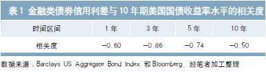 表1 金融类债券信用利差与10年期美国国债收益率水平的相关度