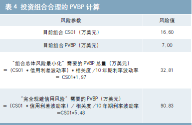 根据投资组合目前的信用风险暴露情况,并结合上述方法,可得到在不同管理目标下投资组合应该承担的合理PVBP,计算结果如表4所示。