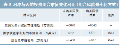 从当时市场实际情况来看,经过半年时间,受金融危机爆发影响,美国金融机构信用利差大幅变宽(从约300BP放宽至700BP左右,变宽幅度约400BP),同时国债收益率也有较大幅度走低(从约3.99%降至2.23%,变化幅度176BP)。表6显示了购买国债进行对冲和不对冲的两种情况对比。