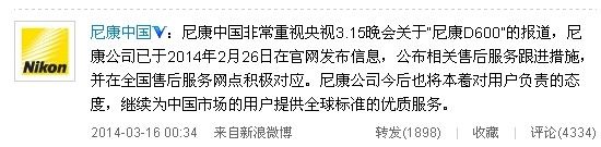 3月15日晚间央视315晚会上曝光了尼康D600单反相机存在画质问题,拍摄的画面有黑色斑点问题,对此事件尼康中国在其新浪官方微博上给出正式回应。