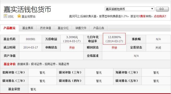 从京东金融的货币基金版块进去http://list.jr.jd.com/fundlist/1-11-112.htm?op=60:105,居然没有和小金库合作的那两款货币基金,我只好转战基金公司官方网站,先看嘉实基金的活钱包收益:
