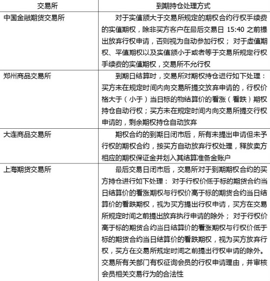 期权与期货到期日的不同步及行权制度的差异需要引起投资者注意。因为若投资者在期权到期日仍未平仓,也未提出行权,那么可能会出现即使是实值合约也无法获利的情况,比如大连商品交易所的仿真期权品种。实值期权未平仓也未行权,意味着不仅无法获得实值部分的收益,连期初投资的全部权利金也将损失掉。具体而言,各交易所目前对到期日的持仓处理制度如表3。