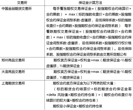 对卖方而言,保证金收取多少是其关心的问题。期权的保证金制度不同于期货,期货保证金是合约价值乘以一个简单的百分比,而期权相对复杂。对比国内四大期货交易所的保证金收取方法,除上海期货交所结合delta的模式外,其余交易所均是从传统的保证金模式引申而来,具体的计算公式如表4。