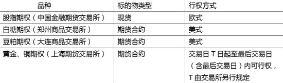 国内四大交易所的期权品种可大体分为两类,中国金融期货交易所的股指期权为金融类期权,郑州商品交易所的白糖期权、大连商品交易所的豆粕期权、上海期货交易所的黄金和铜期权等均属于商品期权。从现阶段的仿真合约设计来看,国内的金融类期权均为现货期权,其期权的标的直接为对应的现货,比如沪深300股指期权的标的为沪深300现货指数,而并非沪深300股指期货。商品期权均为期货期权,对应的标的物为期货合约,比如SR1405系列的期权合约均是以白糖1405期货合约为标的。标的物的不同意味着买方行权后所获得的资产不同,股指期权因是现金交割较为简单,但商品期权行权后获得的是相应的期货部位,所以特别是商品期权行权时,投资者需要考虑账户资金是否足够缴纳行权后的期货保证金。