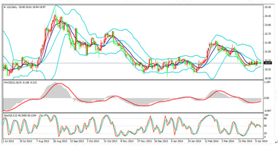 上个交易日现货白银价格在探底后回升,在日线图中以带长下影线的小阴线收盘。Boll轨逐渐收口,银价调整在boll中轨线附近。均线方面,5日均线水平运行,银价运行在5日均线附近。指标方面,MACD指标向上运行,空头能量柱微幅缩减;stoch指标双线形成死叉下行。