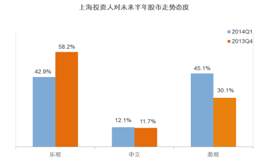 具体来看,在上海投资人方面,看好未来中国股市走势的上海投资人由上季度的58.2%降至42.9%,对中国股市走势持中立态度的投资人由上季度的11.7%上升至12.1%,而对中国股市持悲观预期的投资人则由上季度的30.1%上升至45.1%。上海投资人持有股票的比例由上季度的69.9%降至54.2%,在股票市场上投入的资金比重由上季度的33.8%降至29.5%,预计增持股票比例由29.8%降至16.1%,几项数据的回落均体现了上海投资人对股市前景相对谨慎的投资态度。