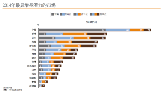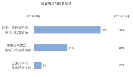 在香港投资人方面,从投资人对于股市的态度来看,近三分之二的香港投资人(62%)认为香港股票市场将维持牛熊争持、反复震荡的格局,31%的香港投资人则对未来股市走势持悲观预期,仅7%的香港投资人对未来香港股票市场持乐观态度。77%的香港投资人表示股票在投资组合比例中会维持不变,而上季度则有达32%表示会增持股票。本期的“2014年最具增长潜力市场”调查板块,在“首要最具增长潜力市场”的投票中,中国市场与香港市场得票比例为44: 5;在“前三位最具增长潜力市场”的投票中,中国市场与香港市场得票比例为173:53。在沪港通背景下,此数据显示出相当比例的香港投资人对A股市场有兴趣。