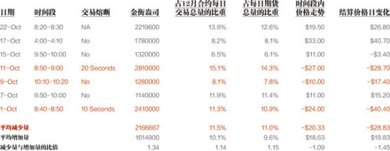 当240万盎司黄金在10月1日这一天内转手时,价格在10分钟内下跌了每盎司24美元。相反地,10月22日,当天交易量的12%都发生在那10分钟内,价格在当天收盘时上涨了每盎司26美元。