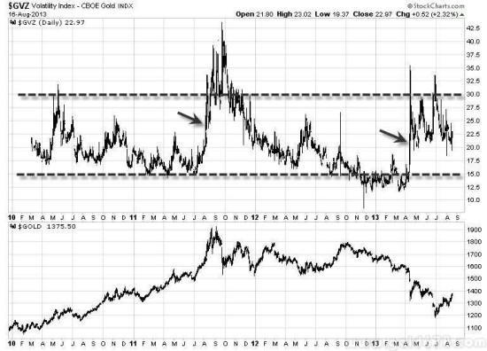 我们还可以看到市场情绪从2012年10月一直到2013年的一季度非常低迷,GVZ指数已经破了15而且在15以下运行了很长一段时间。如果单看这个指数那么你会考虑在这个情绪的底部区间去做多。但是我们说过,情绪指数是个辅助的维度,如果从其他几个维度来看,这个位置显然还不到做多的时候。当然我们也无法预计后面的那个疑似被操控的下跌,但这个时候做多显然有点太早。所以不能简单只看一个维度就做出交易的决定,况且GVZ只是我们要看的第一个情绪指标,其实还有好几个情绪指标都可以看,GVZ只是其中的一个。
