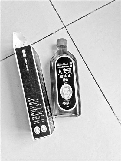 这瓶“珮夫人”的包装上,所有字体均是繁体字。其产品说明书上写着,该药的特效配方包括磷酸可待因和麻黄素,前者可以直接抑制延髓的咳嗽中枢,后者对中枢的兴奋作用较强,对呼吸中枢亦有刺激作用。注意事项一栏中写着:“服用过量有危险。”