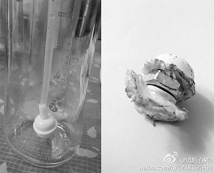 放置在奶瓶中,与吸管相连接的配重球本身并不大,但是在近镜头的拍摄下,洁白的外包下露出锈迹斑斑的金属物,而且锈迹也将包裹层内壁污染,这更加刺激到年轻父母的神经。