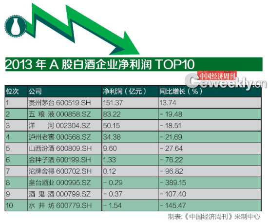 以五粮液为例,2013年,五粮液实现营业收入和净利润分别为247.19亿元和83.22亿元,分别同比下降9.13%和19.48%。这也是10多年来五粮液的业绩指标首次没有正增长。