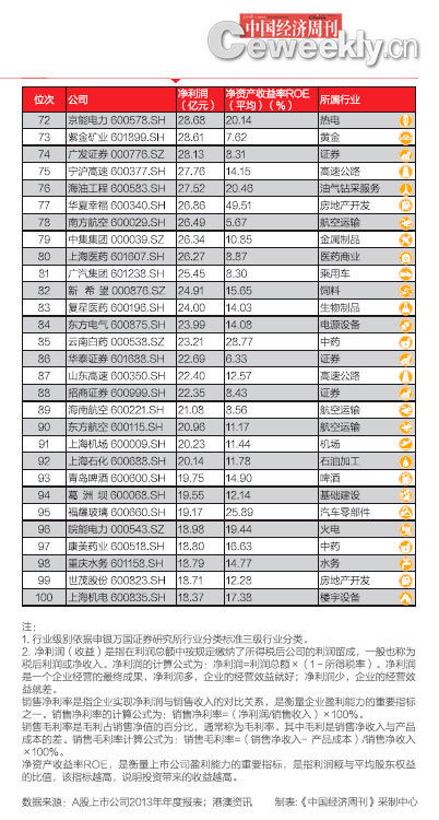 在《中国经济周刊》统计的2013年A股净利润排名前100家公司,即“2013年A股最赚钱公司100强”中,有我们熟悉的拥有垄断资源的企业,如银行和石油企业,也有一些不具备垄断资源的“小个头”公司,他们凭借其在行业内的领先地位一举挤进最赚钱公司排行榜。