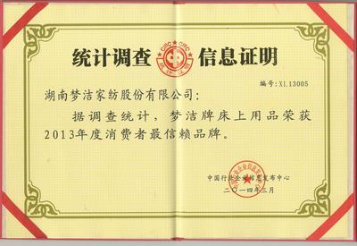 2014年3月22日,梦洁家纺再获中国行业企业信息发布中心颁布的“2013年度消费者最信赖品牌”、“2013年度全国商超渠道同类产品销量第一名”两项殊荣。