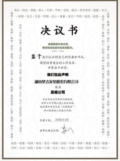 2006年以后,梦洁家纺开始将爱进行细化,形成了“品格第一”的企业文化。为什么说是细化呢?因为单纯的讲“爱”是很难落地的。而“品格第一”则更好的将“爱”进行了动作的诠释,49种品格将爱从各方面进行了标准化的定义。在这个阶段,梦洁家纺做了大量的品格第一培训,姜天武先生更是签署了要做“品格第一”的企业承诺书。