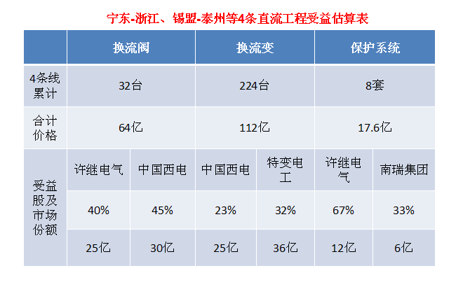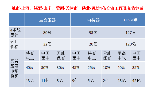 按照上述观点,特高压工程如此密集的开建,将带给平高电气(600312.SH)、中国西电(601179.SH)、特变电工(600089.SH)、许继电气(000400.SZ)、*ST天威(600550.SH)、金利华电(300069.SZ)、大连电瓷(002606.SZ)、创元科技(000551.SZ)、风范股份(601700.SH)、齐星铁塔(002359.SZ)、东方铁塔(002545.SZ)等特高压设备厂商前所未有的盛宴。