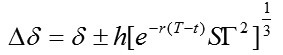 区间对冲模型,即实时计算期权的Delta值,如果Delta值在可容忍的对冲区间(±Δδ)内,则不进行Delta对冲;如果δ值超出了可容忍的对冲区间,则进行Delta对冲。对冲比率有两种:一是一次性将δ值对冲到0;二是采用最小对冲比率,将δ值对冲到容忍区间的边界(±Δδ)。Whalley&Wilmott采用后者,得出区间对冲区间的计算公式: