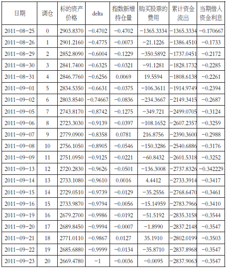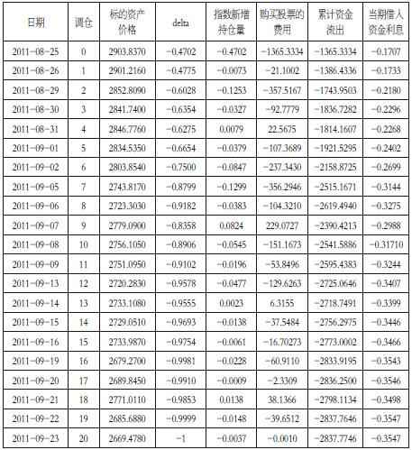 我们选取沪深300指数作为标的,选择2011年1月4日到2011年9月23日的数据计算其收益率标准差作为波动率,无风险利率设定为3%。选择2011年8月24日到2011年9月23日的实际交易数据,复制期限为20个交易日的看跌期权,Delta每天调整一次。表1是动态复制期权的调整细节,每次再平衡时间点,根据当时的指数计算出期权的Delta(即复制期权所需要持有的指数头寸),累计的借入资金需要付出的利息,以及累计的资金流出,期末,按照指数的持仓量与当前的累计资金净流出计算出模型期权的费用。
