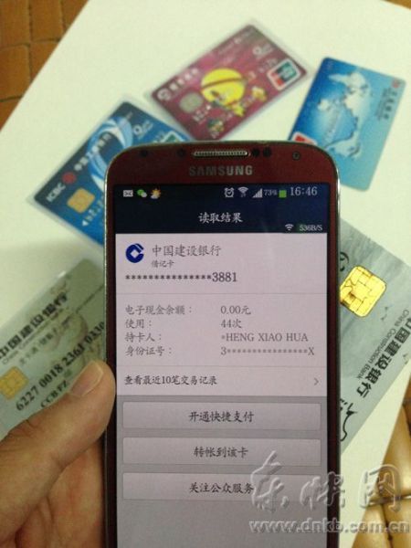 为了测试传言是否属实,昨日,东南快报记者使用一部支持NFC功能的三星GalaxyS4手机分别对5张银行卡进行了测试。