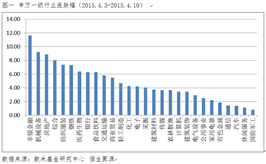 图一 申万一级行业涨跌幅(2015.4.3-2015.4.10)\