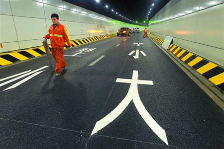 昨日,施工人员在延安东路隧道内画线、调试信号指示灯。 本报记者 张海峰 摄