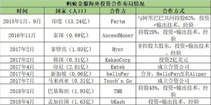 从蚂蚁金服布局的亚洲国家来看,一个主要的共同点在于:较大的人口流量。亚洲在人口数量上本已占优,除中国之外的6个人口过亿的亚洲国家(印度、印度尼西亚、巴基斯坦、日本、孟加拉、菲律宾),除日本之外,都被蚂蚁金服纳入版图。