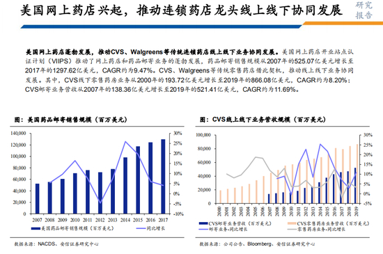 传统连锁药房最终成为药品零售核心渠道,网上药店成为线下药店的有效补充1999年美国全国药房理事会(NABP)启动网上药店开业站点认证计划(VIIPS),保证网售处方药的安全性,推动美国网上药店的蓬勃发展。CVS、Walgreens等传统零售药店借此契机,推动线上线下业务协同发展。其中,CVS线下零售药房业务从2000年的193.72亿美元增长至2019年的866.08亿美元,CAGR约为8.20%;CVS邮寄业务营收从2007年的138.36亿美元增长至2019年的521.41亿美元,CAGR约为11.69%。由于处方流量较大、购药便利属性突出、医疗服务属性强等竞争优势,传统连锁药房能充分抵御互联网渠道的冲击,传统连锁药房最终成为药品销售核心渠道。2018年CVS和Walgreens在美国处方药销售市占率分别高达24.20%、17.50%,依靠PBM处方流量发展起来的ExpressScripts邮寄药房的处方药销售市占率仅11.00%,缺乏处方流量的独立网上药店Drugstore.com、PlanetRx、Soma.com等难逃被兼并收购和破产清算的命运。