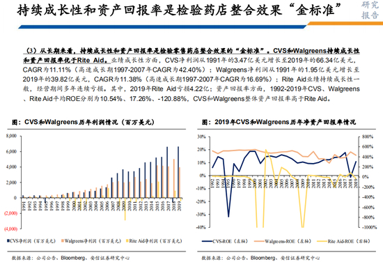 根据美国国家统计局的数据,美国零售药房市场规模从1996年的918.10亿美元增长至2018年的2858.70亿美元,行业增速从1996年的6.95%下降至2018年的2.68%,行业增速放缓和竞争加剧引发行业整合。CVS、Walgreens、RiteAid均企图通过兼并收购实现跨区域扩张,巩固和提升自身行业地位,但由于并购整合能力和精细化管理上的差异,最终取得的战略效果却截然不同。其中,CVS和Walgreens通过快速跨区域扩张实现全国布局,奠定美国零售药房行业霸主地位,RiteAid近年来门店数量却不断萎缩。优质药店标的CVS和Walgreens借助行业整合,实现业绩快速增长,CVS净利润从1991年的3.47亿美元增长至2019年的66.34亿美元,高速成长期1997-2007年CAGR高达42.40%;Walgreens净利润从1991年的1.95亿元增长至2019年的39.82亿元,高速成长期1997-2007年CAGR为16.69%。同时,二级市场持续享受高估值,在高速成长期1997-2007年,CVS和Walgreens的PE均值分别为46.34倍、33.29倍。