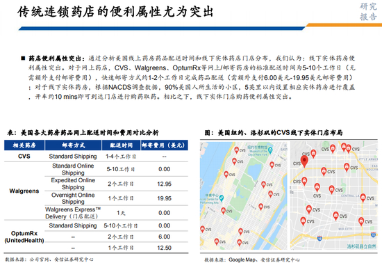 (2)便利属性优势:对于网上药店,CVS、Walgreens、OptumRx等网上/邮寄药房的标准配送时间为5-10个工作日(无需额外支付邮寄费用),快速邮寄方式约1-2个工作日完成药品配送(需额外支付6.00美元-19.95美元邮寄费用);对于线下实体药房,根据NACDS调查数据,90%美国人所生活的小区,5英里以内设置相应实体药房进行覆盖,开车约10mins即可到达门店进行购药取药。相比之下,线下实体门店购药便利属性突出;