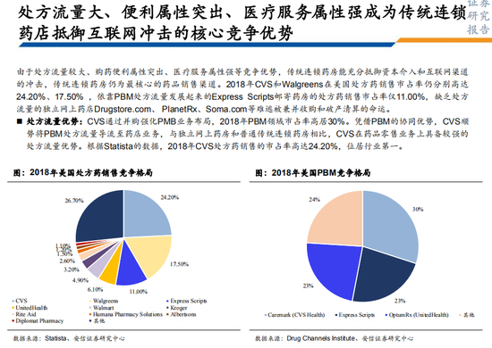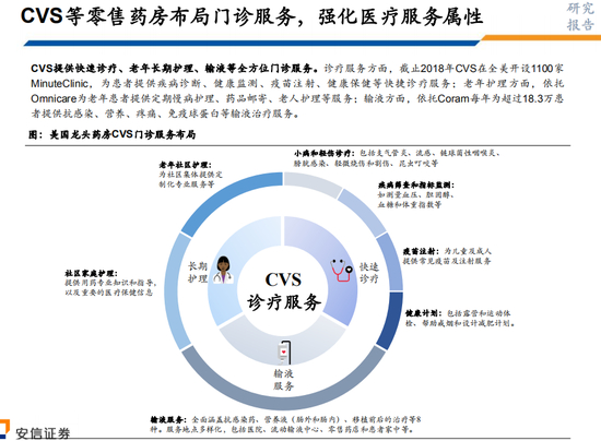 (3)医疗服务优势:CVS、Walgreens等传统连锁药店均通过提供快速门诊、老年长期护理、输液服务等为顾客进行健康管理,线下门店服务成为药店客户核心需求,较强的线下医疗服务能力成为传统连锁药店与网上药店竞争的核心优势之一。