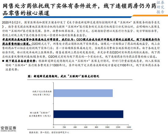 对于网售处方药,考虑到药品属地监管和医保属地支付等因素,预计O2O模式会成为放开网售处方药的主流模式。借鉴美国网上药店的发展历程,并充分考虑O2O对实体药店的依托属性、线下药店的流量优势/便利属性/服务优势,O2O模式实则为线下药店的一个有效补充,线下连锁药房仍为药品零售的核心渠道。其中,流量方面,根据新冠肺炎疫情期间武汉“互联网+”医保支付情况,针对门诊重症慢病患者,纳入医保报销的“互联网+”医疗服务费用至少1300单/天,其中向线下定点药房流转的处方量超过1100单/天,线下实体药店具备绝对的流量优势;便利性方面,美国和国内药店店均服务人口分别为5513.43人/家、2848.67人/家,国内线下连锁药房充分覆盖核心商圈和社区,零售药房覆盖密度高于美国,线下药店的便利属性更为突出;服务方面,线下大型连锁药店通过建立专业慢病管理团队,为慢病患者提供用药指导、顾客档案管理等专业服务,线下药房服务职能更为全面,线下服务能力成为传统连锁药店与网上药店竞争的核心优势。