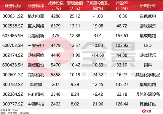 以减持套现金额排名,前10家上市公司被套现金额均超过8亿元。