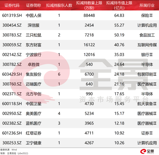 其中,更有10家上市公司的重要股东拟减持市值上限超过10亿元。