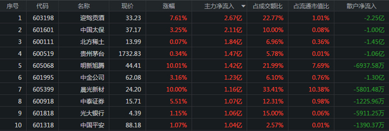 从个股来看,主力资金最青睐的3只股票分别是迎驾贡酒、中国太保、北方稀土,流入金额分别为-2.25亿元、-1亿元、-1.45亿元,所对应的涨幅分别为7.61%、3.25%、0.07%。