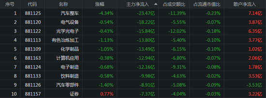 主力资金流出的板块分别是汽车、电气、光电,主力资金流出金额分别为23.47亿元、18.22亿元、15.84亿元,其中散户净流入金额为7.41亿元、3.87亿元、6.35亿元。