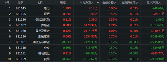 主力资金主要流入电力、银行、保险三个板块,流入金额分别为4.17亿元、3.40亿元、2.36亿元,其中散户净流入金额为-748.66万元、284.11万元、-1.06亿元。三个板块的涨幅分别为1.80%、0.64%、0.11%。