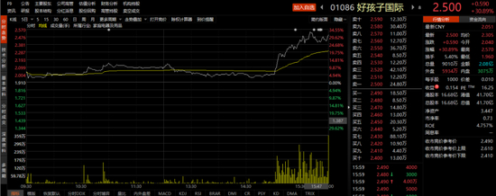 港股好孩子尾盘大涨,最后收涨30.89%,报2.5港元/股。