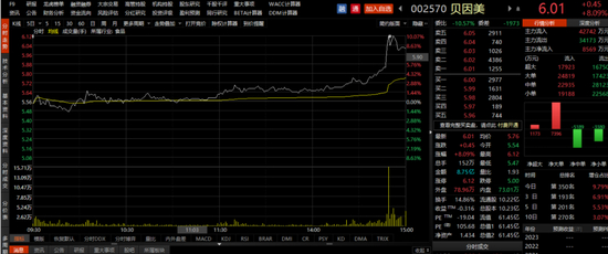 贝因美尾盘也大涨,最后收涨8.09%,报6.01元/股。