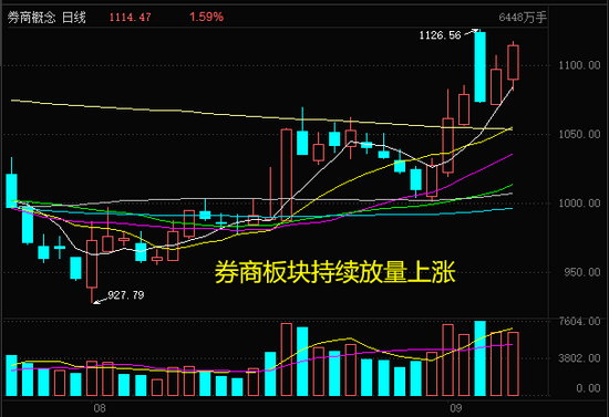 而券商为代表的蓝筹板块却在持续放量,成为推动大盘的上行的主要力量,充分说明这波行情是板块风格切换带来的。