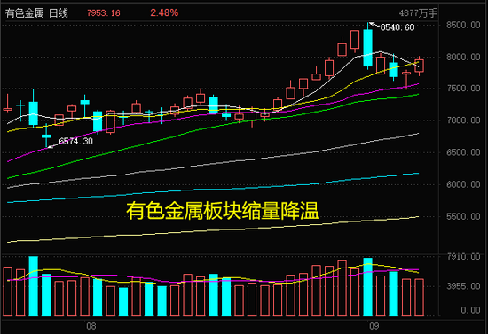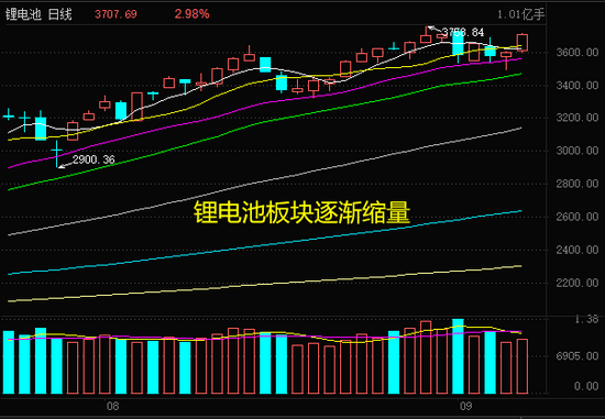而从上周以来,热点明显降温,大家看看锂电、有色金属板块的成交量,从上周的高点明显回落,非常好的佐证了市场成交量为何会萎缩了。