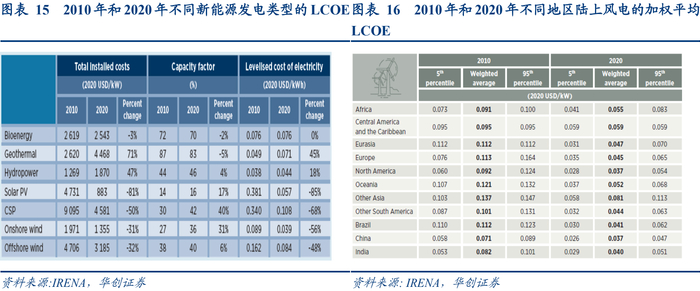 根据国际可再生能源署的数据,海上风电、陆上风电、光伏的平准化度电成本(LCOE)在2010-2020年间分别下降48%、56%、85%。截至2020年,海上风电、陆上风电、光伏的度电成本约在0.54元/KWh、0.25元/KWh、0.37元/KWh。相较于光伏的下降空间来看,陆上风电仍有较大进步空间。中国陆上风电平均LCOE已位于世界前列,2020年为0.24元/KWh。