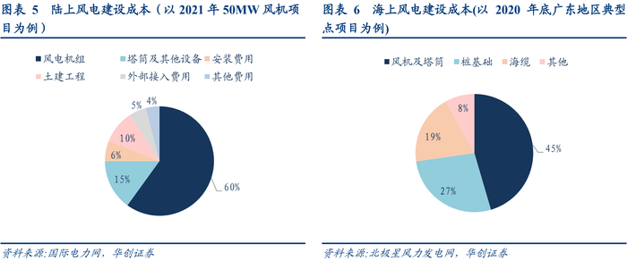 从投资成本来看,海上风电的平均投资成本约为陆上风电的2倍左右,当下海风建设成本在15000-17000元/KW,陆风建设成本在5000-7000元/KW。分别拆分陆上和海上建设成本发现:陆风的风电机组与塔筒占比高,风电机组占比60%,塔筒及其他设备占比15%,其他方面的费用占比相对较少;海风的施工成本相对较高,以广东省海上风电成本构成为例,风电机组与塔筒成本占比合计不超过50%,而风机基础及安装成本占比为25%,在海上吊装船比较紧张的时候,该项成本还会进一步上升。