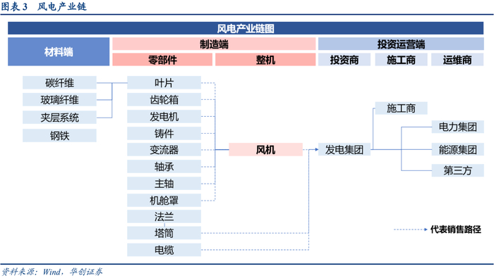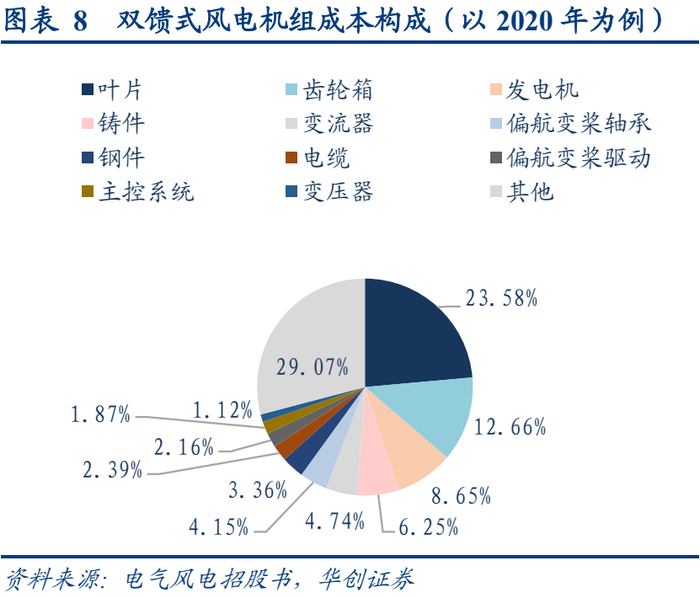 从细分环节来看,叶片、齿轮箱、发电机是风电整机中价值量最大的零部件,成本占比最高。