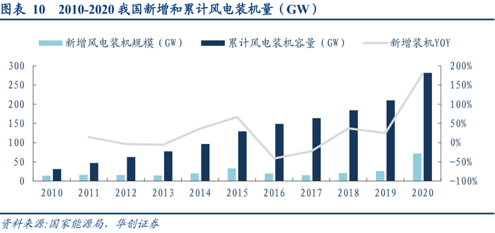 历史上风电装机量根据政策呈现周期波动,新增装机在2015年和2020年分别达到两次高峰,主要是由于补贴政策的调整所致。在2020年陆上风电补贴退出后,风电行业进入了全新的发展阶段。2020年是陆上风电补贴的最后一年,导致陆风抢装,2021年也可能会是海上风电补贴的最后一年,将迎来海风抢装。截至2020年累计装机规模已达282GW,风电行业将有望全面进入按照燃煤标准价上网的时代。