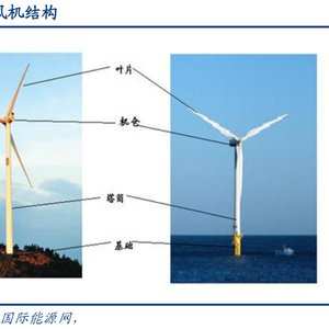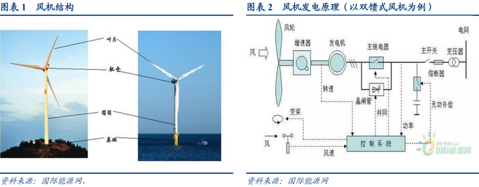 风力发电机是将风能转换为机械功的动力机械,由基座、塔筒、风机、叶片组成。其中:塔筒提升风机高度,并可以作为传输线路的通道;机仓内有各种发电机组和其他控制设备;而叶片是风力发电机组的关键部件之一,其设计、材料和工艺决定风力发电装置的性能和功率。