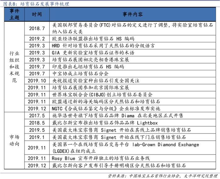 培育钻石的诞生可追溯到上世纪50年代。早在2012-2015年期间,培育钻石就已出现在饰品市场,早期部分商家将其作为天然钻石的仿冒品,培育钻石一度被行业视作洪水猛兽。近年来,随着鉴定技术的发展以及国际国内各大机构企业的规范和推广,培育钻石正在快速地打破以往人们的偏见,被越来越多的品牌和消费者所接受。