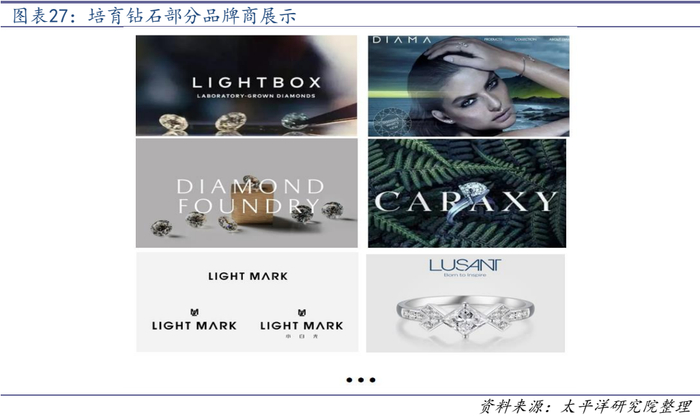 目前全球已有多家品牌成立自己的培育钻石品牌。行业比较标志性的事件是2018年5月,全球最大钻石生产商戴比尔斯官宣,推出培育钻石品牌Lightbox。随着消费市场对培育钻石越来越了解,布局加入培育钻石行业的品牌越来越多:国外如施华洛世奇旗下品牌Diama、美国最大钻石珠宝零售商SignetJewelers旗下品牌Kay、Jared、Zales和线上品牌JamesAllen以及其他众多品牌,国内如CARAXY、LIGHTMARK、以及今年豫园珠宝推出的LUSANT等品牌纷纷加入培育钻石市场。