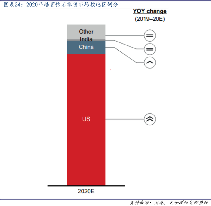 2020年培育钻石零售市场,主要集中在美国、中国、印度三大国家,其中美国份额最高,居于首位,2020年同比较前一年快速提升;中国市场份额排第二,较美国而言相对较小,但是同比也在增加,正在逐步扩大培育钻石零售规模,未来潜力很大;印度和其他地区基本保持持平。