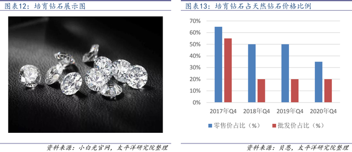与此同时,天然钻石由于自身的稀缺性,导致价格昂贵。培育钻石零售价占天然钻石的比例则持续降低,2017年Q4为65%,2020年Q4仅为35%,下降30pct,未来随着技术的进步,价格有望进一步下降。